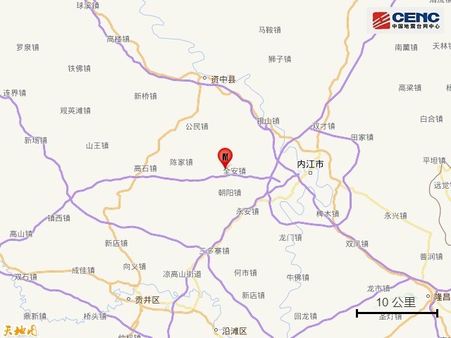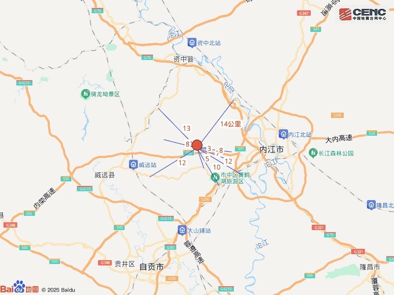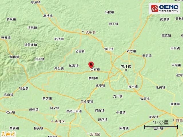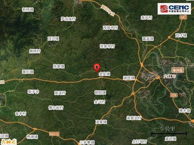 周边县城:震中距市中区17公里、距东兴区18公里、距资中县20公里、距威远县22公里、距大安区28公里,距内江市16公里,距成都市142公里。